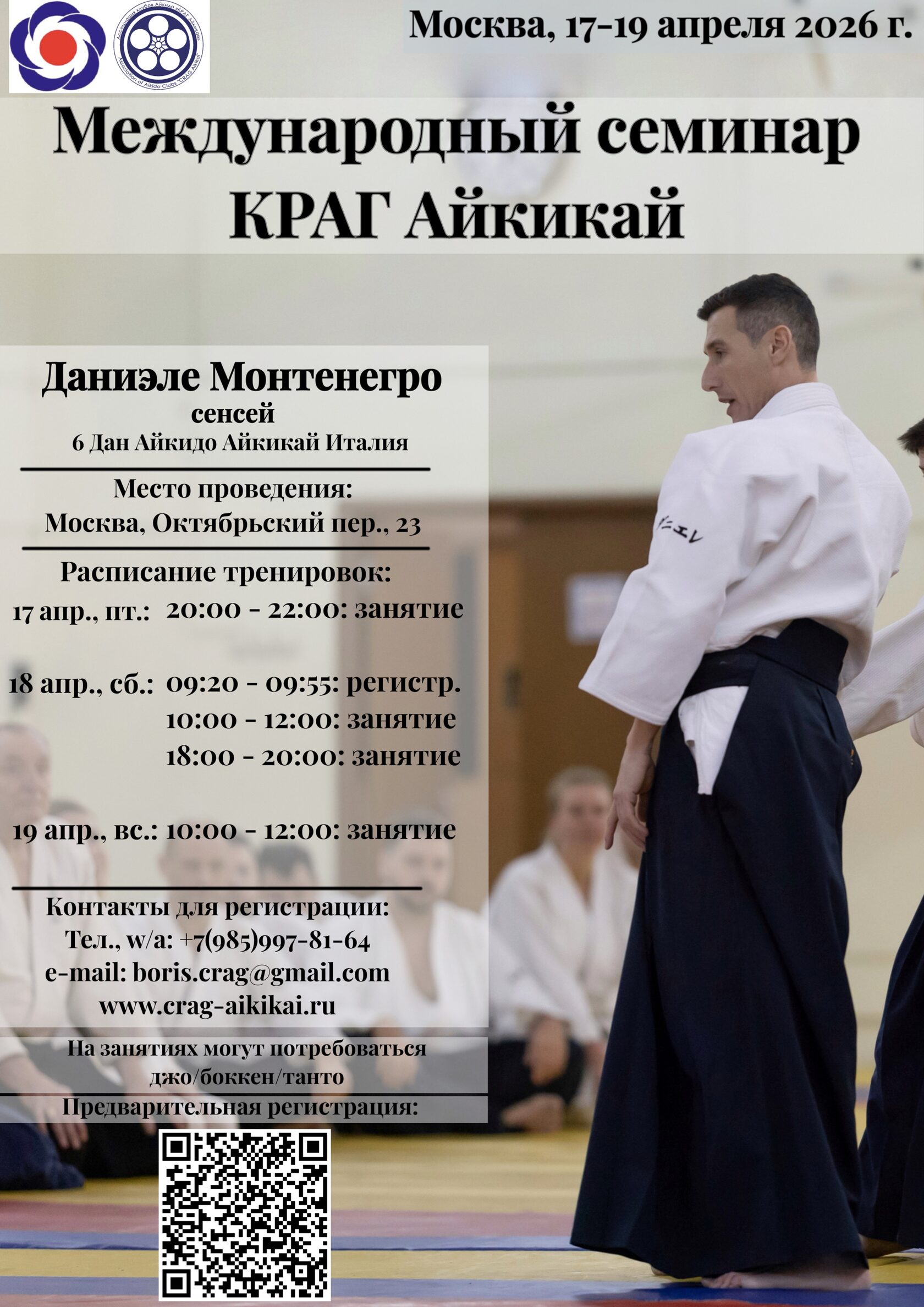 Приглашаем всех желающих к участию в Международном семинаре КРАГ под руководством Д.Монтенегро сенсея, 6 дан Айкидо Айкикай Италия, который состоится 17-19 апреля 2026 года в Москве.
